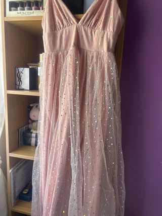 Vestido de fiesta con un diseño brillante y elegante. - Tejido principal en tono rosa. - Detalles de lentejuelas plateadas por toda la prenda. - Tirantes finos y escote en V.