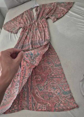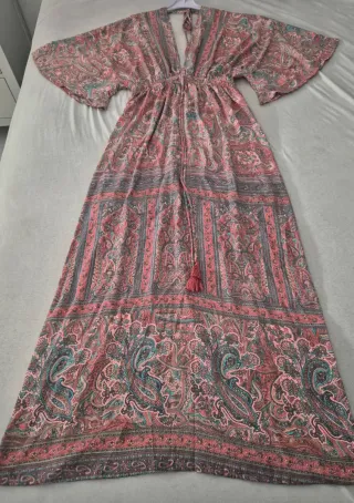 Vestido largo con estampado paisley en tonos rojos y morados. Presenta un cuello en V y cierre de botones. - Mangas cortas abullonadas. - Cintura elástica. - Falda con volantes. En total 8 prendas (5 vestidos largos,un mano larga y 2 camisetas oversize