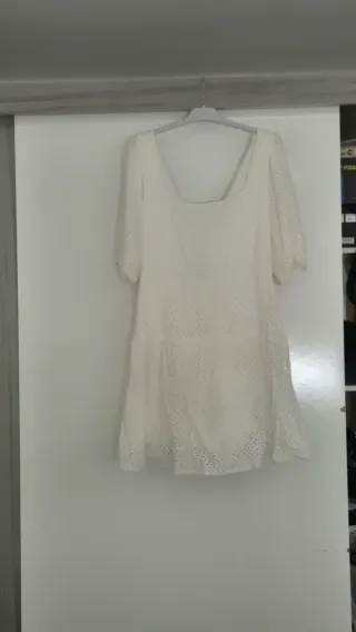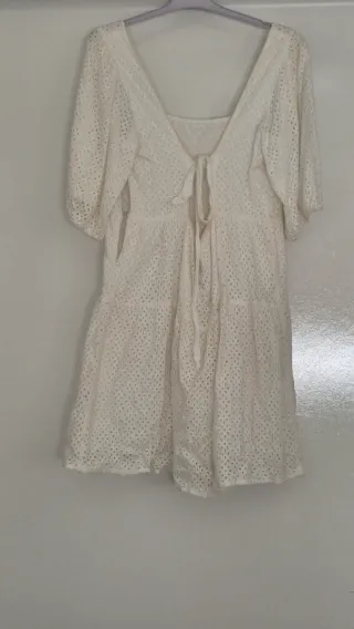 Vestido blanco con un delicado bordado. - Lazo en la espalda - Mangas cortas abullonadas. - Tejido ligero y transpirable.