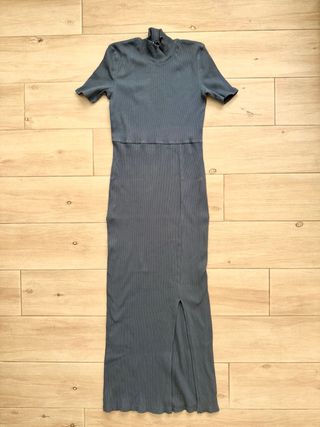 Vestido midi de punto con cuello alto y manga corta. - Diseño ajustado. - Abertura lateral en la falda. - Tejido acanalado. - Color azul azafata