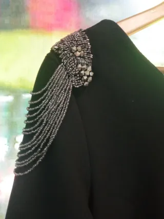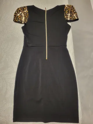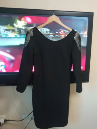 Elegante vestido de fiesta negro con detalles de pedrería en los hombros.Un solo uso en noche vieja.Tejido elastan muy buena calidad ,queda monísimo,marca la silueta.Las fotos no le hacen méritos. - Diseño con mangas largas. - Adornos plateados en los hombros. - Escote en V pronunciado en la espalda.