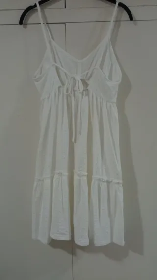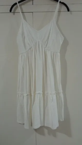 Vestido blanco con tirantes finos y escote en V. Presenta un diseño fruncido en la zona del pecho y una falda con volantes. - Tejido con textura. - Diseño de dos capas en la falda.