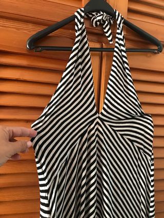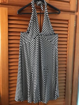 Vestido de verano con un diseño de rayas clásico. - - Estampado de rayas blancas y negras. - Diseño tipo halter. Equivaldra a una 40/42.
