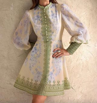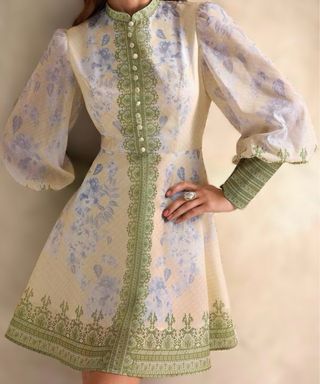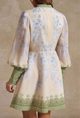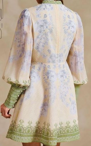 Vestido con un estampado floral delicado y detalles en verde. - Mangas abullonadas transparentes. - Cuello alto con botones. - Cintura marcada. - Largo mini. medidas: Hombro: 37cm, Largo: 91 cm, Largo de la manga: 69.5 cm, Pecho: 96 cm, Contorno cintura: 77.3 cm, puño: 22 cm