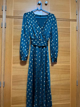 Vestido de corte cruzado con un acabado satinado brillante. Ideal para ocasiones especiales. - Manga larga. - Detalle de botones en la cintura. - Bajo con abertura lateral.