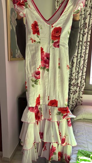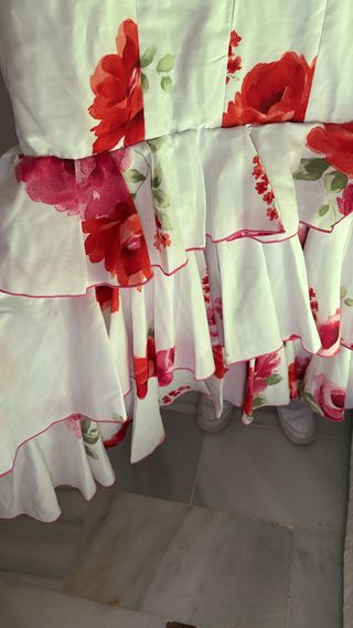 Vestido de estilo gitano con estampado floral. - Diseño con volantes en cascada. - Mangas cortas con volantes. - Escote en V con ribete. - Cremallera central.