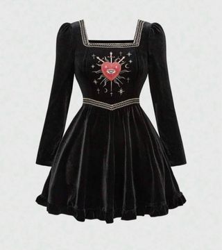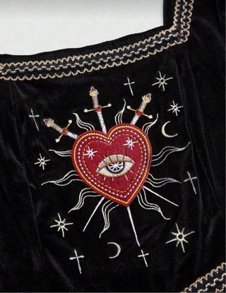 Vestido de terciopelo con un diseño único en el pecho. - Escote cuadrado. - Mangas largas abullonadas. - Detalle bordado de corazón con ojo y espadas. - Cintura con adornos. - Falda con vuelo y volantes en el bajo.