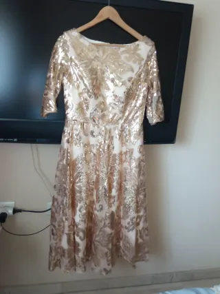 Elegante vestido de fiesta con un diseño brillante y festivo.Esta sin usar ,queda monísimo. - Cubierto de lentejuelas doradas. - Mangas cortas. - Largo hasta la rodilla.