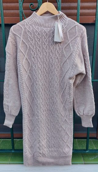 Vestido de punto de manga larga en color beige. Su tejido acanalado le da un toque moderno y elegante. - Tejido acanalado. - Manga larga.