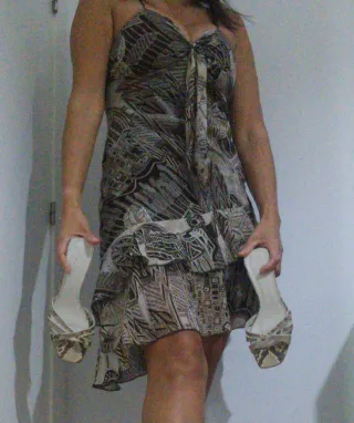 Conjunto de vestido y sandalias a juego con un estampado llamativo. - Vestido con detalle de nudo en el escote. - Sandalias de tiras cruzadas.