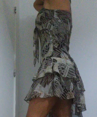 Vestido midi de manga larga con un diseño frontal étnico y volantes. - Cuello en V. - Estampado geométrico en el pecho. - Manga larga. - Largo midi. Queda bien tanto a talla M como L.