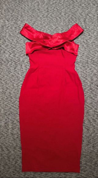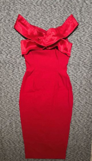 Vestido de corte ceñido con escote Bardot, ideal para eventos especiales. Su diseño asimétrico y el detalle de volantes en el escote le dan un toque sofisticado. - Escote Bardot. - Detalle de volantes. - Corte ceñido.