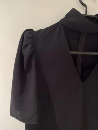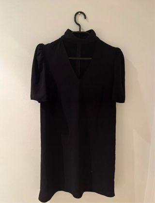 Vestido negro de Zara con cuello alto y escote en V. - Manga corta abullonada. - Diseño moderno y elegante.