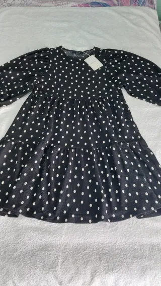 Vestido de Bershka con un diseño de lunares. - Manga larga abullonada. - Corte escalonado con varios volantes. - Cuello redondo.