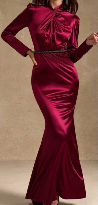 Vestido largo de satén en un llamativo tono rojo. Su diseño presenta un escote drapeado y un cinturón fino que realza la silueta. - Tejido de satén brillante. - Escote con drapeado. - Cinturón fino incluido. - Corte sirena. Vestido de sirena de manga larga con línea de cintura de strass ideal para ir elegante en estas fiestas Talla L Mirar bien las medidas!! Medidas: Hombro: 38 cm Pecho: 106 cm Contorno cintura: 84 cm Contorno caderas: 97 cm Largo: 141/147 cm Largo de la manga: 64 cm contorno biceps: 38.1 cm puño: 23.5 cm Nuevo con etiqueta Envío 24 horas!