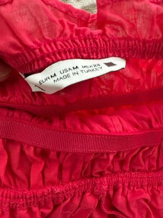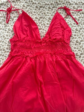 Vestido de Zara con un vibrante color rosa y detalles de volantes. - Diseño con tirantes finos. - Cintura elástica fruncida. - Falda con vuelo y volantes.
