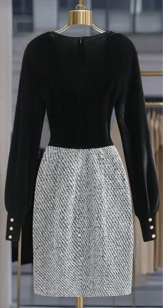 Elegante vestido de dos piezas con cuerpo de terciopelo y falda de tweed. - Cuerpo de terciopelo negro con cuello drapeado. - Mangas largas abullonadas. - Falda de tweed gris con detalle de botones nacarados. - Diseño de doble botonadura en la falda.