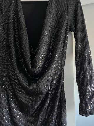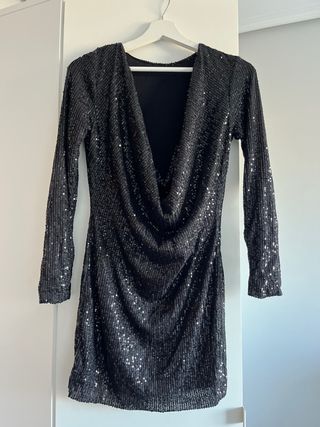 Vestido corto con lentejuelas. (Perfecto para estas fechas) - Diseño con escote pronunciado. - Manga larga. - Tejido con brillo.