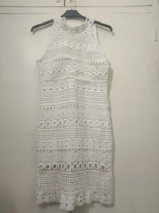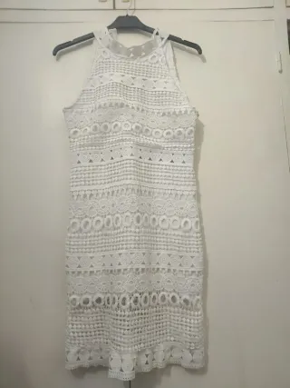 Vestido de encaje con un diseño delicado y elegante. - Cuello halter. - Diseño sin mangas. - Elaborado en encaje. - Largo hasta la rodilla. PRECIO ALGO NEGOCIABLE...