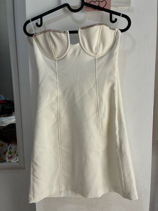 Vestido blanco de Zara con detalles brillantes en el escote. - Diseño tipo corsé. - Escote corazón con pedrería. - Largo mini.