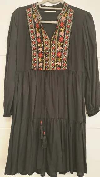 Vestido negro con un diseño de bordados florales multicolor en el pecho y detalles en las mangas. - Cuello en V con cordones y borlas. - Mangas largas abullonadas. - Diseño escalonado con volantes. - Bordados florales en hilo de colores.