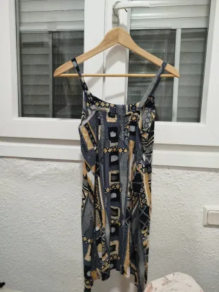 Vestido con un llamativo estampado geométrico y de líneas. - Diseño con tirantes. - Patrón multicolor y gris.