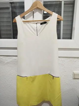 Vestido de corte recto con detalle de cremalleras en la parte inferior. - Diseño sin mangas. - Escote en V. - Cremallera central en la espalda.