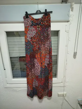 Vestido largo sin mangas con un estampado vibrante y llamativo. - Diseño strapless. - Detalle anudado en el pecho. - Largo hasta los tobillos.