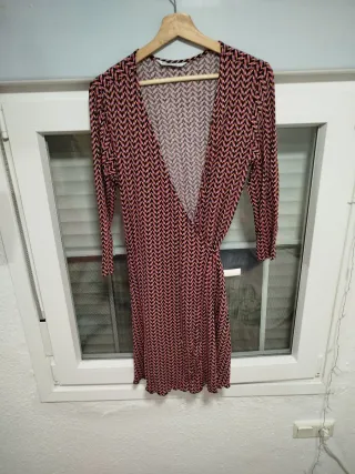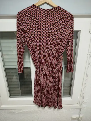 Vestido elegante de color rojo con detalles de cremallera. - Diseño cruzado en la parte delantera. - Cremallera decorativa y funcional en el lateral. - Mangas tres cuartos.