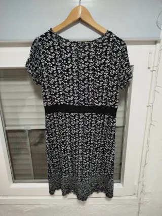 Vestido de manga larga con un estampado geométrico en blanco y negro. El diseño es moderno y versátil. Es calentito mide de hombro 38 y de cintura 90, es anchito - Manga larga acampanada. - Cuello redondo. - Cierre de botón en la espalda.