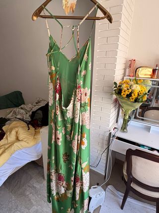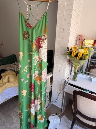 Vestido largo con un vibrante estampado floral sobre fondo verde. - Diseño con tirantes finos. - Escote en V. - Largo midi.