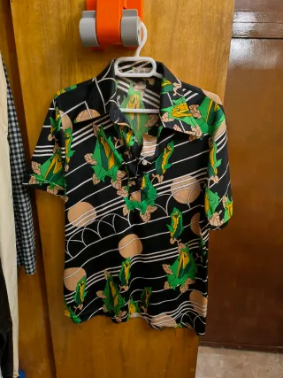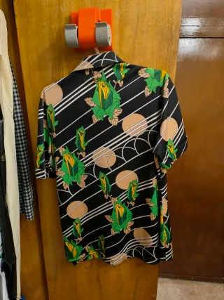 Vestido con un llamativo estampado. - Diseño con cuello - Manga corta - Estampado de figuras verdes y detalles en beige y blanco