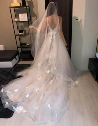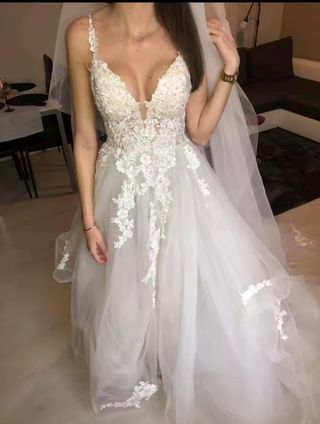 Elegante vestido de novia largo con detalles de encaje. Vestido de novia largo bohemio con espalda descubierta, flores en 3D, tirantes finos, vestidos de novia de princesa hasta el suelo. TALLA ESPAÑOLA XS S DE PECHO 90/95. "SIN ESTRENAR". REF: 011 - Diseño con tirantes finos. - Cuerpo con escote pronunciado y aplicaciones de encaje. - Falda voluminosa de tul. - Adornos de encaje floral en la falda.
