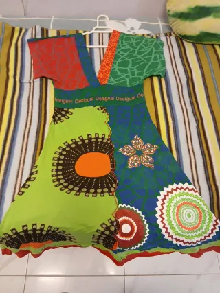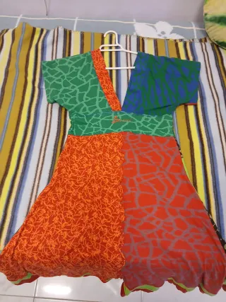 Vestido de la marca Desigual con un diseño vibrante y original. - Estampado llamativo en varias secciones. - Corte asimétrico y escote pronunciado. - Mangas cortas.