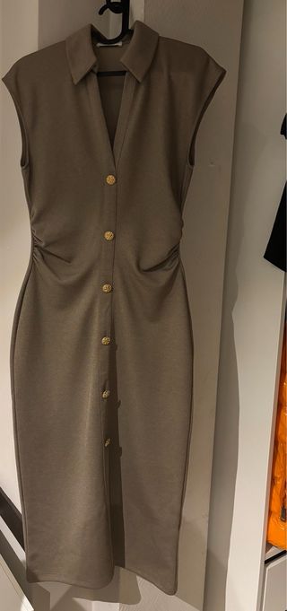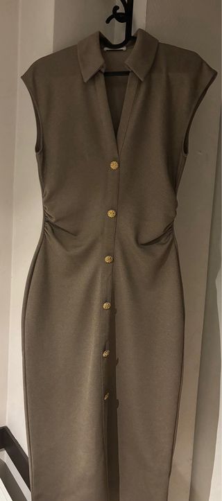 Vestido de Zara, completamente nuevo. Diseño elegante con detalles fruncidos en los laterales y botones dorados. - Cuello camisero. - Manga corta. - Cierre de botones. - Largo midi.