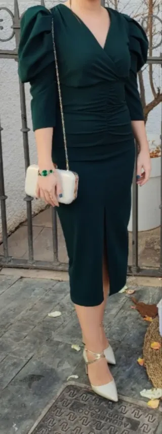 Elegante vestido midi de color verde botella. - Diseño con escote cruzado. - Detalle de fruncido en la cintura. - Manga abullonada. - Abertura en la falda. Talla M/L. Tiene un par de hilos saltados por detrás, se puede ver en la foto. Por lo demás está perfecto, solo puesto una vez.