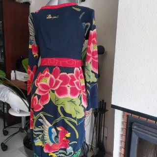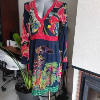 Vestido de manga larga con un estampado vibrante y llamativo. - Diseño con motivos florales y una figura de geisha con sombrilla. - Cuello en V con detalle de botones. - Bajo con estampado geométrico. Medidas en las fotos