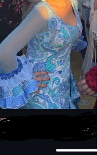 Vestido de estilo flamenco con un bonito estampado de cachemir en tonos azules y blancos. LAS MANGAD AHORA ESTAN LARGAS COMO EN LA SEGUNDA FOTO PERFECTO ESTADO