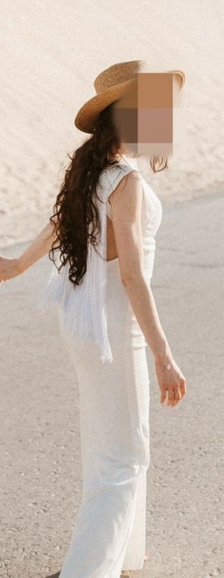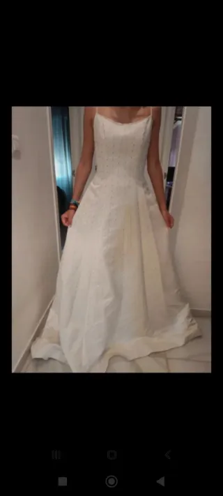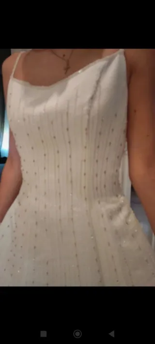 Simple, elegante, tiene unos detalles preciosos en la espalda. Me lo puse una vez para las fotos postboda. Talla XS. (yo peso 48 kg) pero creo que va hasta para una S.