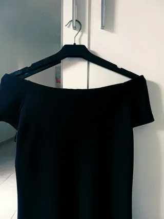 Precioso Vestido negro ajustado de cuello barco, sencillo y elegante. Tejido elástico que se ajusta muy bien al cuerpo. Ideal para combinar tanto en looks formales como casuales.