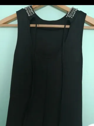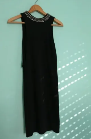 Elegante vestido negro sin mangas, perfecto para ocasiones especiales. Destaca por su detalle de pedrería en el cuello. - Cuello adornado con pedrería. - Diseño sin mangas. - Largo hasta la rodilla.
