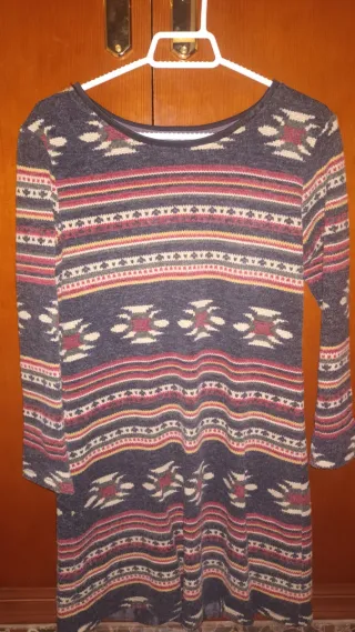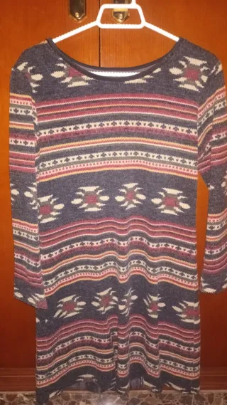 Vestido de manga larga con un diseño de inspiración étnica. - Tejido suave y cómodo. - Estampado geométrico en tonos grises, rojos y amarillos. - Corte recto.