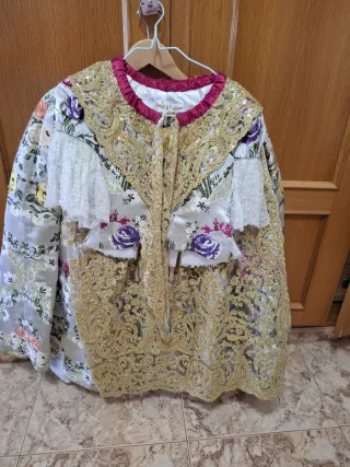Vestido tradicional de fallera con un diseño floral vibrante. Talla sobre 36-38. Solo puesto unas fallas. Medidas:falda largo 97,cintura 38;corpiño pecho 44,manga largo 34 (ver fotos) Incluye: corpiño,falda, manteletas,mantilla, cancán (Margarita Vercher,modelo Alicia Maxi largo 95-cintura 85 con tirantes) y zapatos (t-38)+ tela sobrante *La falda tiene aprox 25cm para sacar* - Tejido principal en tono azul claro. - Estampado floral multicolor. - Delicado encaje blanco en cuello y mangas