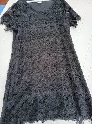 Conjunto de vestido y americana en color negro. El vestido es de encaje y la americana es lisa. - Vestido de encaje con manga corta. - Americana de corte clásico.
