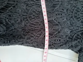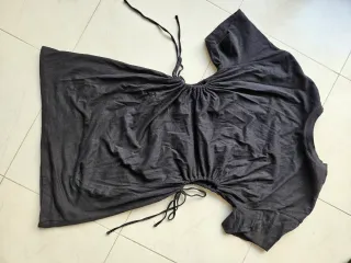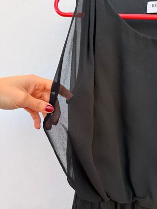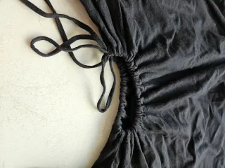 Vestido negro con cordones ajustables. - Diseño fruncido en la parte superior. - Mangas cortas. - Bajo con cordones para ajustar. - pequeña apertura lados sexy.