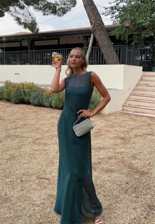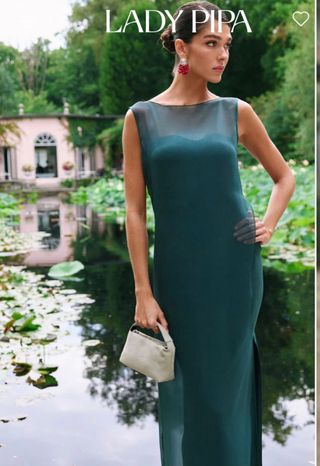 Elegante vestido largo de color verde, con un diseño sofisticado. - Tejido ligero y fluido. - Escote redondo con detalle de transparencia. dos piezas: base palabra de honor con apertura lateral y sobre el vestido gasa del mismo color es de esta temporada - Silueta entallada que cae hasta el suelo. - Abertura lateral en la falda. marca Lady Pipa a estrenar