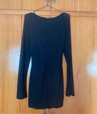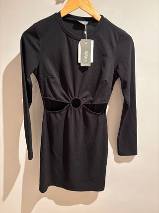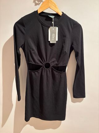 Vestido negro de manga larga con detalles cut-out en la cintura. - Diseño ajustado. - Detalle de anilla metálica en la parte frontal. - Tejido elástico.