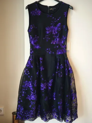 Elegante vestido de fiesta con un diseño llamativo. - Cuerpo del vestido con lentejuelas moradas. - Falda de tul con detalles florales. - Corte acampanado.