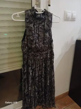 Elegante vestido de mujer con un estampado floral en tonos grises y negros. Su diseño sin mangas y cuello alto lo hacen ideal para diversas ocasiones. - Diseño sin mangas. - Cuello alto. - Cintura fruncida para un ajuste favorecedor. - Largo midi.