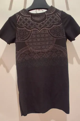 Vestido de Zara con un diseño elegante y detalles brillantes. - Manga corta. - Cuello redondo. - Adornos con pedrería y bordados. - Corte recto.